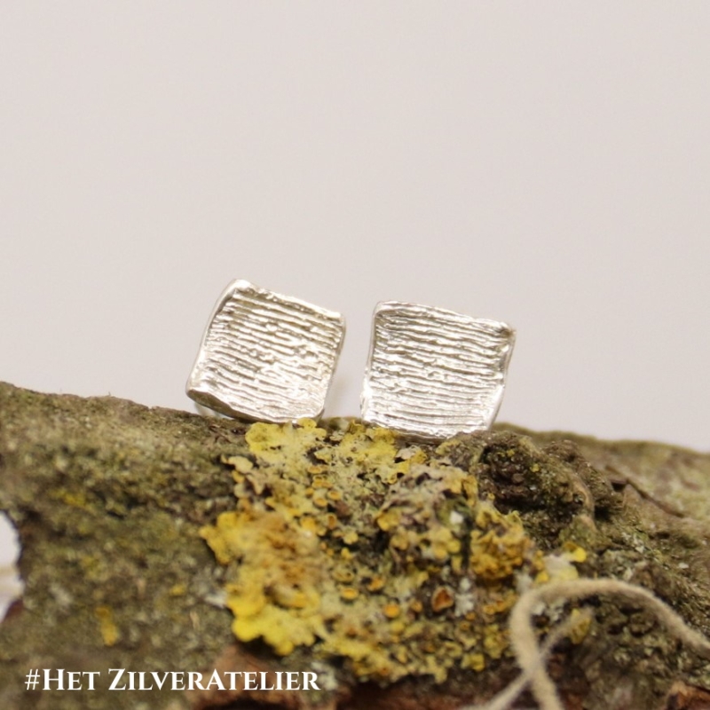 Zilveren vierkante oorstekers met een gestreepte structuur.