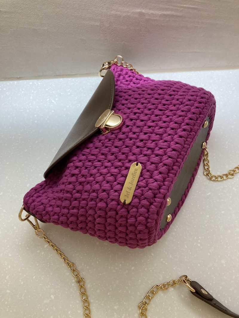 Deze tas combineert speels haakwerk in een diepe frambooskleur met een stijlvolle flap in imitatieleer. De goudkleurige details en ketting geven de tas een luxueuze uitstraling.