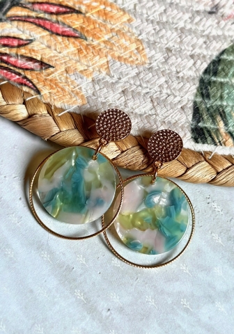 Een prachtige gemarmerde, ronde hanger van resin in de kleuren blauw-groen-grijs-taupe waarrond een metalen ringetje bungelt, hangen aan een goudkleurig, nikkelvrij oorstekertje. De tekening van elke hanger is anders en elk paar is dus uniek!