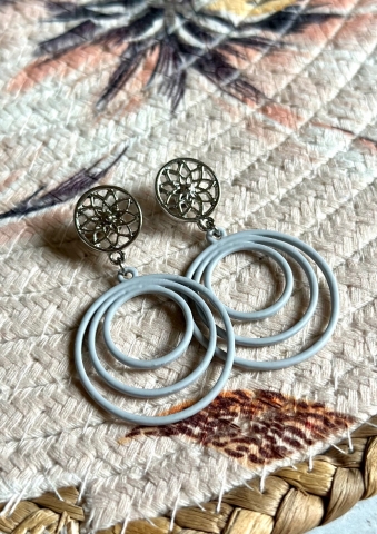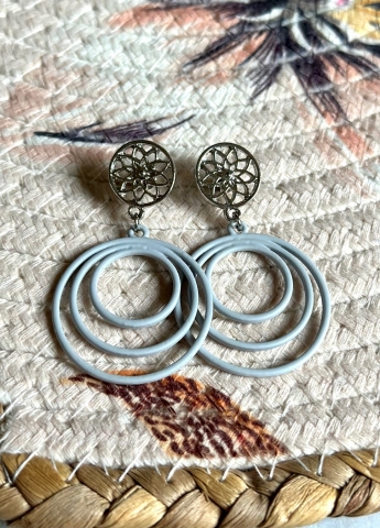 Zilverkleurige, nikkelvrije oorstekers werden gecombineerd met een metalen hanger met lichtgrijze rubbercoating. Fijn om te dragen en licht van gewicht. Ongeveer 4 cm lang.