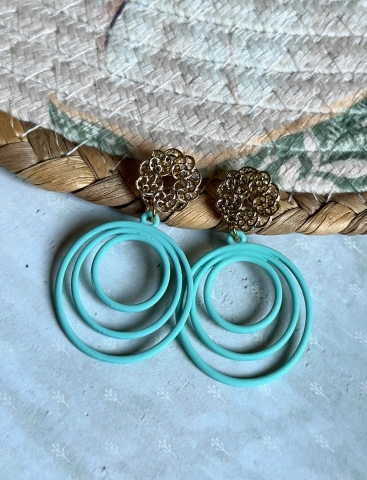 Zilverkleurige, nikkelvrije oorstekers werden gecombineerd met een metalen hanger met turquoise rubbercoating. Fijn om te dragen en licht van gewicht. Ongeveer 4 cm lang.