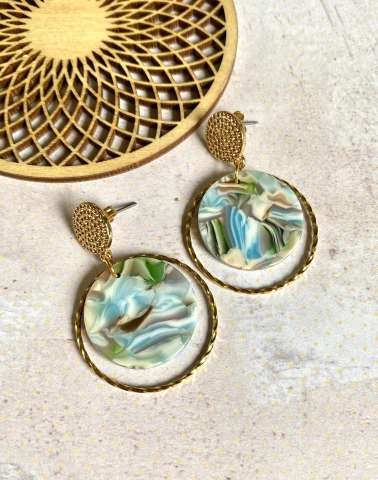 Een prachtige gemarmerde, ronde hanger van resin in de kleuren blauw-groen-grijs-taupe waarrond een metalen ringetje bungelt, hangen aan een goudkleurig, nikkelvrij oorstekertje. De tekening van elke hanger is anders en elk paar is dus uniek!