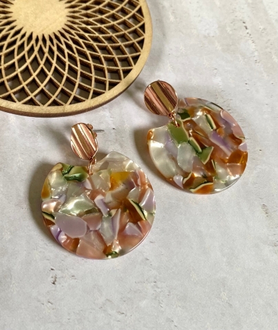 Deze hangers uit resin hebben een supermooie kleurencombinatie van zachte tinten! Elke hanger is uniek. Ze hangen aan rosékleurige, nikkelvrije oorstekers.