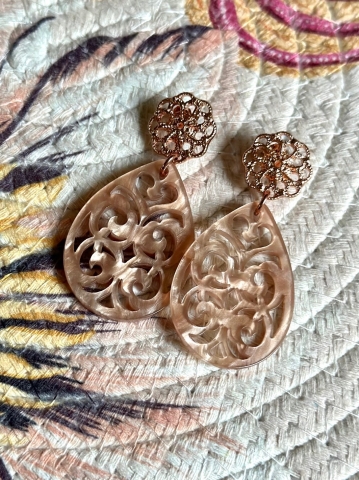 Deze nude oorbellen zijn licht van gewicht dankzij de opengewerkte hangers van resin. Ze hangen aan rosékleurige nikkelvrije oorstekers in de vorm van een bloem.