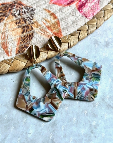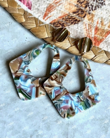 Deze hangers uit resin hebben een mooie kleurencombinatie van blauw, beige, groen en hier en daar wat oudroze. Elke hanger is uniek! Ze hangen aan goudkleurige, nikkelvrije oorstekers.