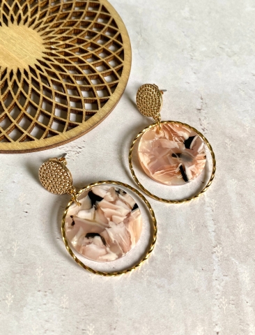 Een prachtige lichtroze gemarmerde, ronde hanger van resin waarrond een metalen ringetje bungelt die nét een tikkeltje groter is, hangen aan een goudkleurig, nikkelvrij oorstekertje. De tekening van elke hanger is anders en elk paar is dus uniek!
