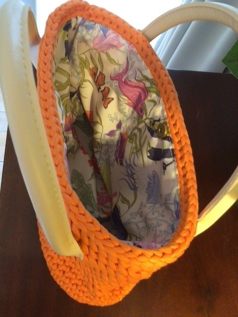 Fris oranje handtasje dat de show Steelt . Dit tasje is gevoerd met een speels stofje met vismotief.