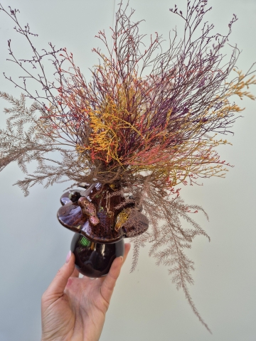 Paddestoel met vogels opgevuld met gekleurde limonium.