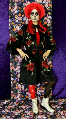 Panty Black and red is een merkloze panty. Het ene been is rood met doodskoppen; het ander is zwart.