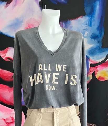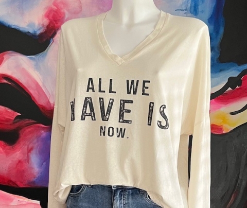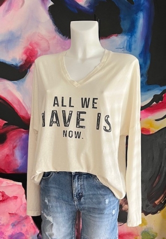 Shirt Maxima grijs of off-white is een shirt van het merk Banditas from Marseille. Net niet zwart met tekst : all we have is now. Zoveel waarheid op één shirt met lange mouwen en V-hals. Het shirt is gemakkelijk combineerbaar.