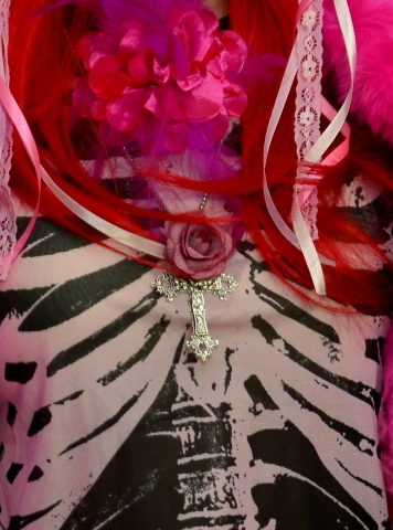 Shirt Skeleto is een lang shirt met de tekening van een skelet in het roze. Het shirt is transparant. Ook het bekken staat er nog op getekend.