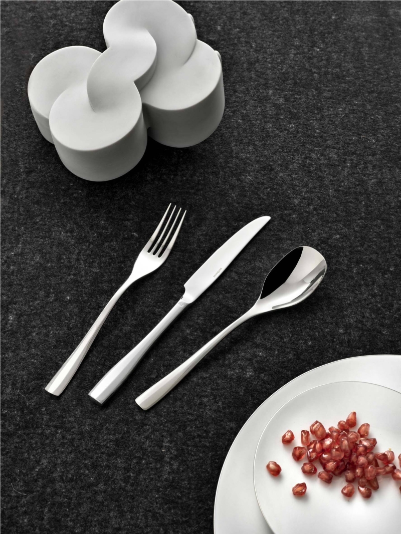 Tafelbestek Inox 18/10 "Sintesi" 24 stuks inclusief: 6 Tafelmessen 6 Tafelvorken 6 Tafelmessen 6 Koffielepels Zeer elegant, modern en stevig tafelbestek. Italiaans fabrikaat Sambonet staat voor stijl, kwaliteit en schoonheid. Elk Sambonet-item, bestek of holwerk, is een uniek project, gebouwd op geschiedenis, onderzoek, ontwikkeling en, net als een kunstwerk, op originaliteit. Gemaakt met voorname ambachtelijke zorg, kwaliteit van materialen, productietechnieken van de nieuwste generatie en geheimen die zijn doorgegeven uit de zilversmidstraditie van het bedrijf, vertegenwoordigen de collecties met messen, vorken, lepels en nog veel meer bestekitems de perfecte combinatie van Italiaanse uitmuntendheid, vakmanschap en goede smaak .