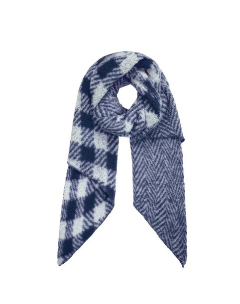 Half geruite, half gestreepte wintersjaal, verkrijgbaar in camel en blauw.