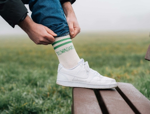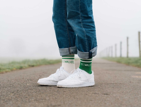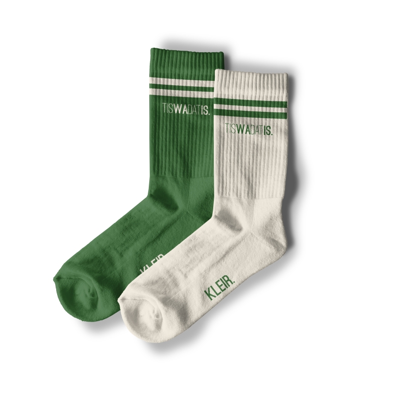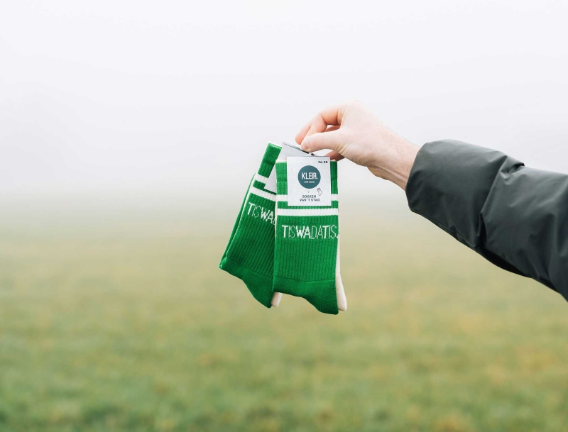 Comfortabele groene en witte sokken met opschrift TISWADATIS. voor volwassenen. De kousen zijn stevig, redelijk dik en hebben een normale pasvorm met een extra verdikking aan de zool voor extra comfort. Als cadeau of gewoon voor jezelf. Recht uit Antwerpen. Met trots voor het dialect.