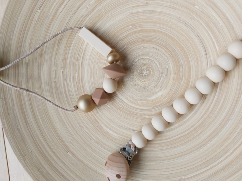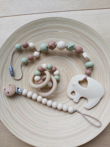 Deze speenkoord past perfect bij de leuke speelkoord met beige olifant, de halsketting beige met goud of de bijtring met houten ringen.