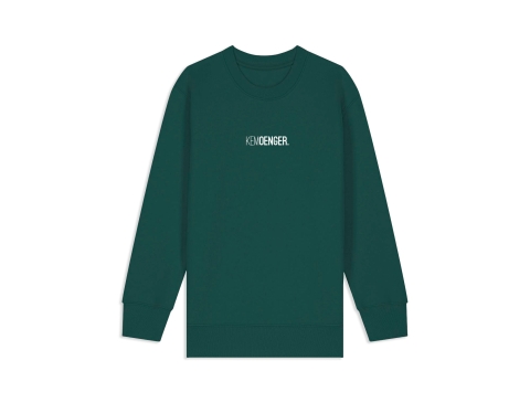Groene sweater met opschrift KEMOENGER. voor kinderen. Als cadeau of gewoon voor jezelf. Recht uit Antwerpen. Met trots voor het dialect.