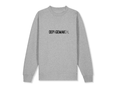 Grijze sweater met opschrift OEPAGEMAKEH. voor volwassenen. Als cadeau of gewoon voor jezelf. Recht uit Antwerpen. Met trots voor het dialect.