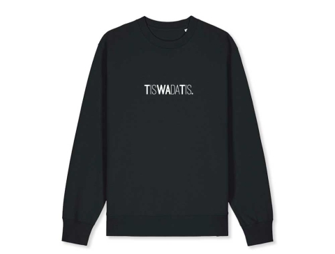 Zwarte sweater met opschrift TISWADATIS. voor volwassenen. Als cadeau of gewoon voor jezelf. Recht uit Antwerpen. Met trots voor het dialect.