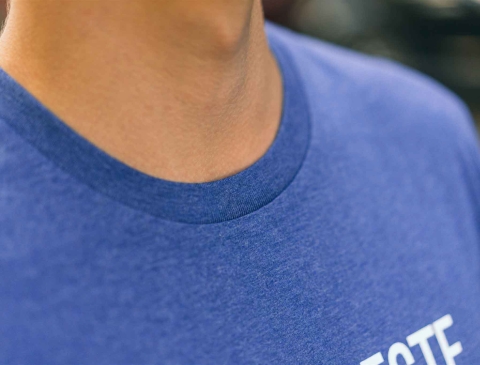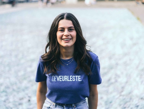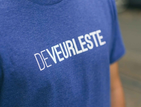 Blauwe T-shirt met opschrift DEVEURLESTE. voor mannen en vrouwen. Als cadeau of gewoon voor jezelf. Recht uit Antwerpen. Met trots voor het dialect.