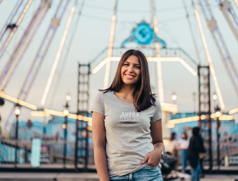 Grijze T-shirt met opschrift JUFFRA TOERTJES. voor vrouwen. Als cadeau of gewoon voor jezelf. Recht uit Antwerpen. Met trots voor het dialect.