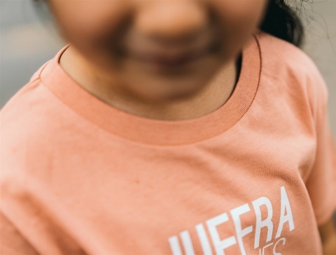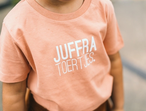 Roze T-shirt met opschrift JUFFRA TOERTJES. voor kinderen. Als cadeau of gewoon voor je eigen kind. Recht uit Antwerpen. Met trots voor het dialect.