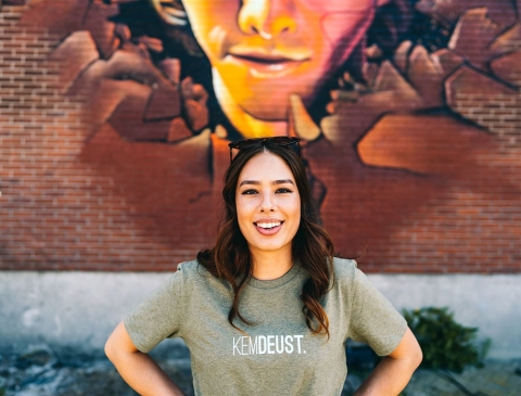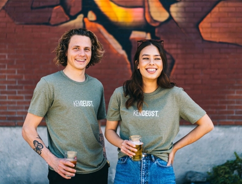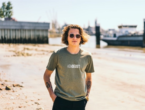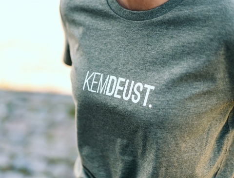 Kaki T-shirt met opschrift KEMDEUST. voor vrouwen en mannen. Als cadeau of gewoon voor jezelf. Recht uit Antwerpen. Met trots voor het dialect.