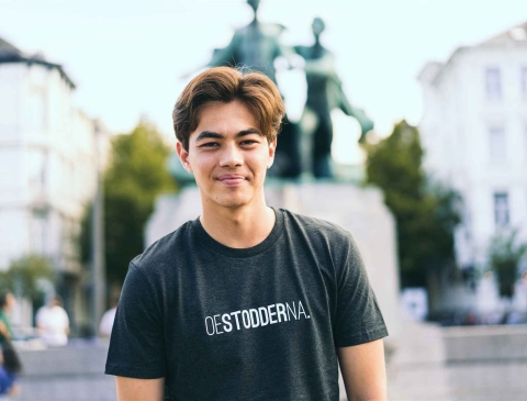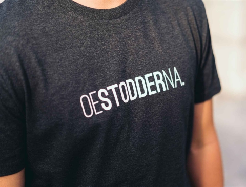 Grijze T-shirt met opschrift OESTODDERNA. voor mannen en vrouwen. Als cadeau of gewoon voor jezelf. Recht uit Antwerpen. Met trots voor het dialect.