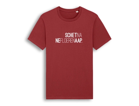Rode T-shirt met opschrift SCHETNANEFLOERENAAP. voor volwassenen. Als cadeau of gewoon voor jezelf. Recht uit Antwerpen. Met trots voor het dialect.