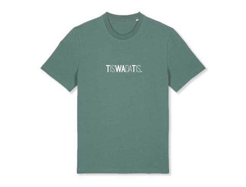 Groene T-shirt met opschrift TISWADATIS. voor volwassenen. Als cadeau of gewoon voor jezelf. Recht uit Antwerpen. Met trots voor het dialect.