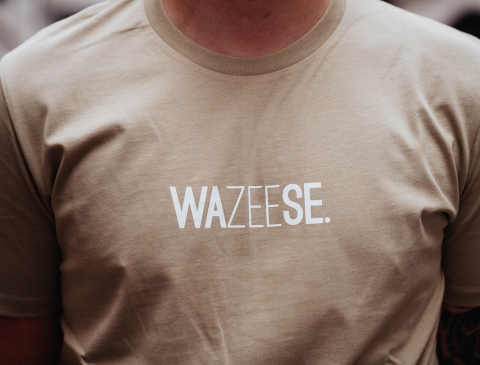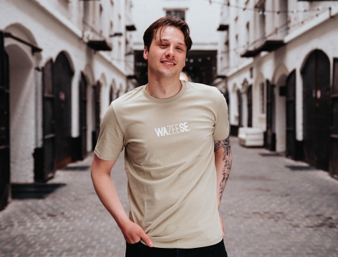 T-shirt in de kleur sage met opschrift WAZEESE. voor volwassenen. Als cadeau of gewoon voor jezelf. Recht uit Antwerpen. Met trots voor het dialect.
