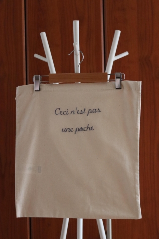 De tote bags mogen niet in de wasmachine. Is ze vuil en wil je ze terug proper krijgen? Maak de vlek een beetje nat en wrijf de vlek in met een natuurlijk wasmiddel zoals ossengalzeep. Laat even intrekken en spoel uit. Zitten er wat kreuken in die je eruit wil strijken? Dat kan, maar je strijkt best de achterkant. Als je toch de voorkant wil strijken, leg je er best een doek over zodat je niet rechtstreeks op het borduursel strijkt.