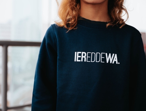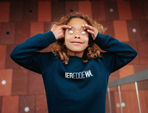Donkerblauwe trui met opschrift IEREDDEWA. voor kinderen. Recht uit Antwerpen. Met trots voor het dialect. Als cadeau of gewoon voor je eigen kind.