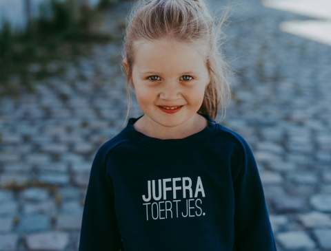 Blauwe trui met opschrift JUFFRA TOERTJES. voor kinderen. Recht uit Antwerpen. Met trots voor het dialect. Als cadeau of gewoon voor je eigen kind.