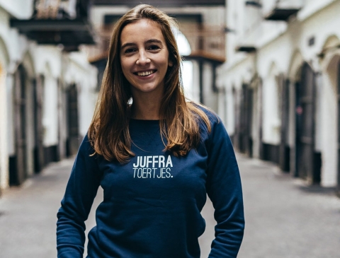 Donkerblauwe trui met opschrift JUFFRA TOERTJES. voor vrouwen. Als cadeau of gewoon voor jezelf. Recht uit Antwerpen. Met trots voor het dialect.