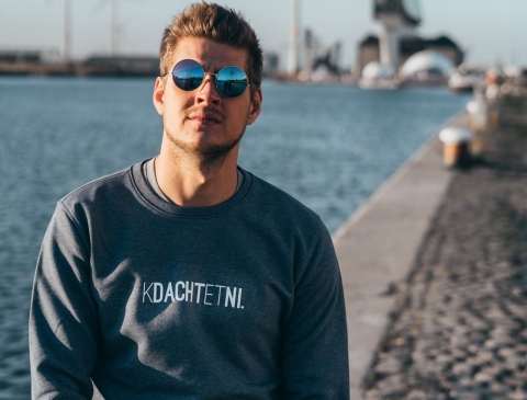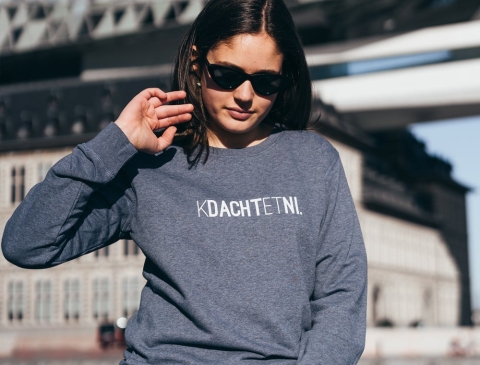 Blauwgrijze trui met opschrift KDACHTETNI. voor vrouwen en mannen. Als cadeau of gewoon voor jezelf. Recht uit Antwerpen. Met trots voor het dialect.