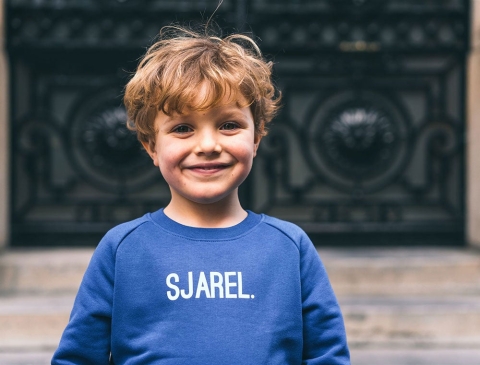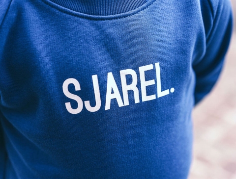 Blauwe trui met opschrift SJAREL. voor kinderen. Recht uit Antwerpen. Met trots voor het dialect. Als cadeau of gewoon voor je eigen kind.