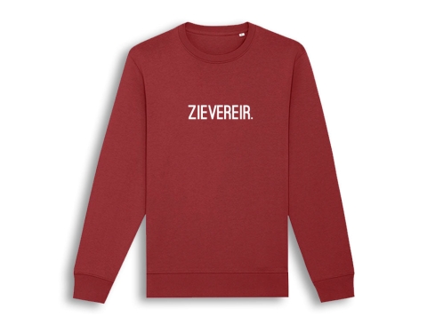 Rode trui met opschrift ZIEVEREIR. voor volwassenen. Als cadeau of gewoon voor jezelf. Recht uit Antwerpen. Met trots voor het dialect.