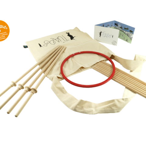 Inhoud: ring (gemaakt van het biologische materiaal Arboblend), doorsnede 26,5 cm 2 x 2 stokken om mee te werpen/vangen (stoklengte 50 cm) 8 houten stokken om bv de ring omheen te werpen (lengte 30 cm) korte gebruiksaanwijzing in het Nederlands, met plaatjes en spelsuggesties, uitgebreide spelregels zijn te vinden op de site van tualoop.de handige draagtas om het spel in op te bergen en te vervoeren Het spel wordt geleverd in een kartonnen doos.