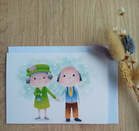 Formaat postkaarten: A6 (148mm x 105mm) Inhoud: 1 gevouwen kaart, 1 omslag en 1 sticker aan de hand van de wenskaart.
