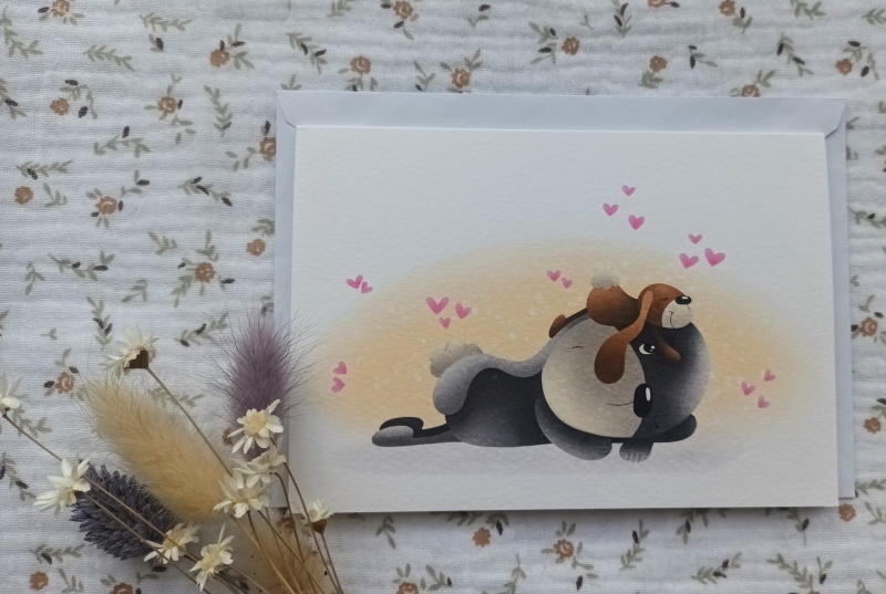 Formaat postkaarten: A6 (148mm x 105mm) Inhoud: 1 gevouwen kaart, 1 omslag en 1 sticker aan de hand van de wenskaart.