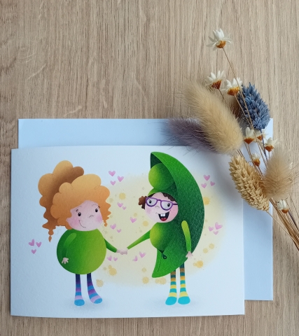 Formaat postkaarten: A6 (148mm x 105mm) Inhoud: 1 gevouwen kaart, 1 omslag en 1 sticker aan de hand van de wenskaart.