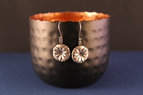 Handgemaakte zilveren oorbellen met bloemmotief, gezwart, om een “oud zilver look” te krijgen
